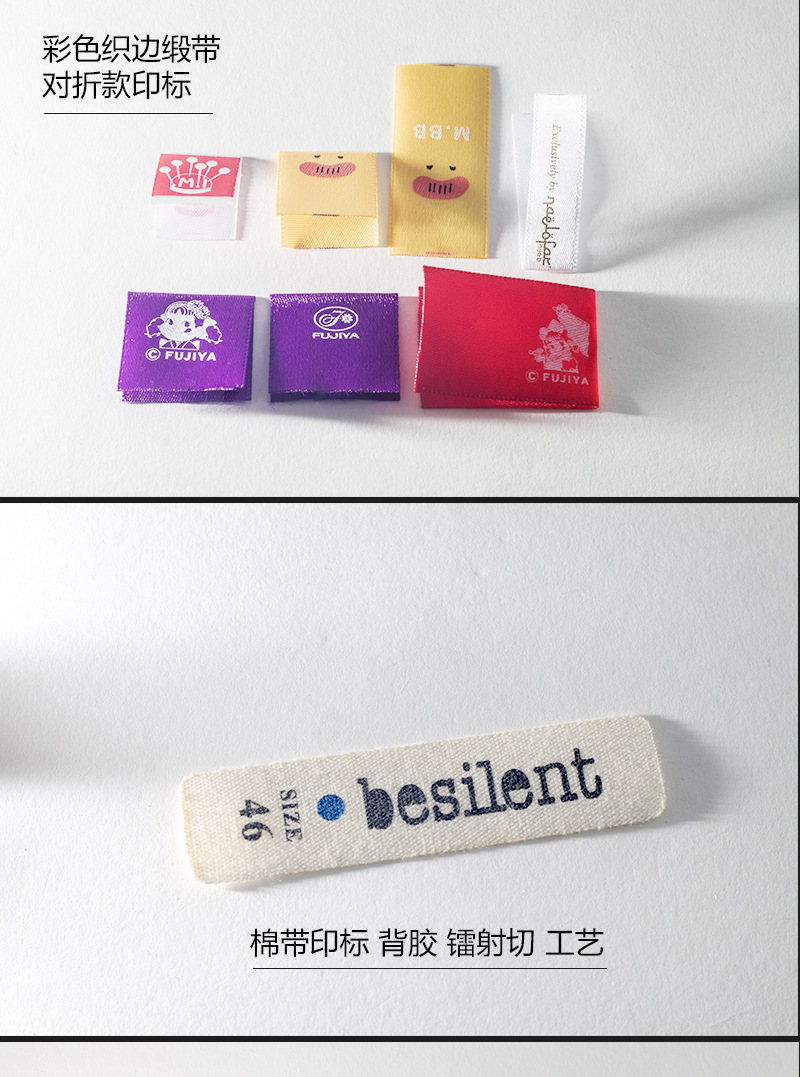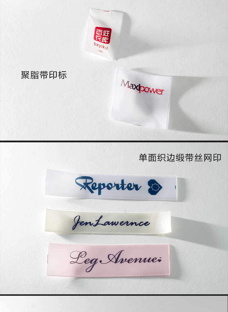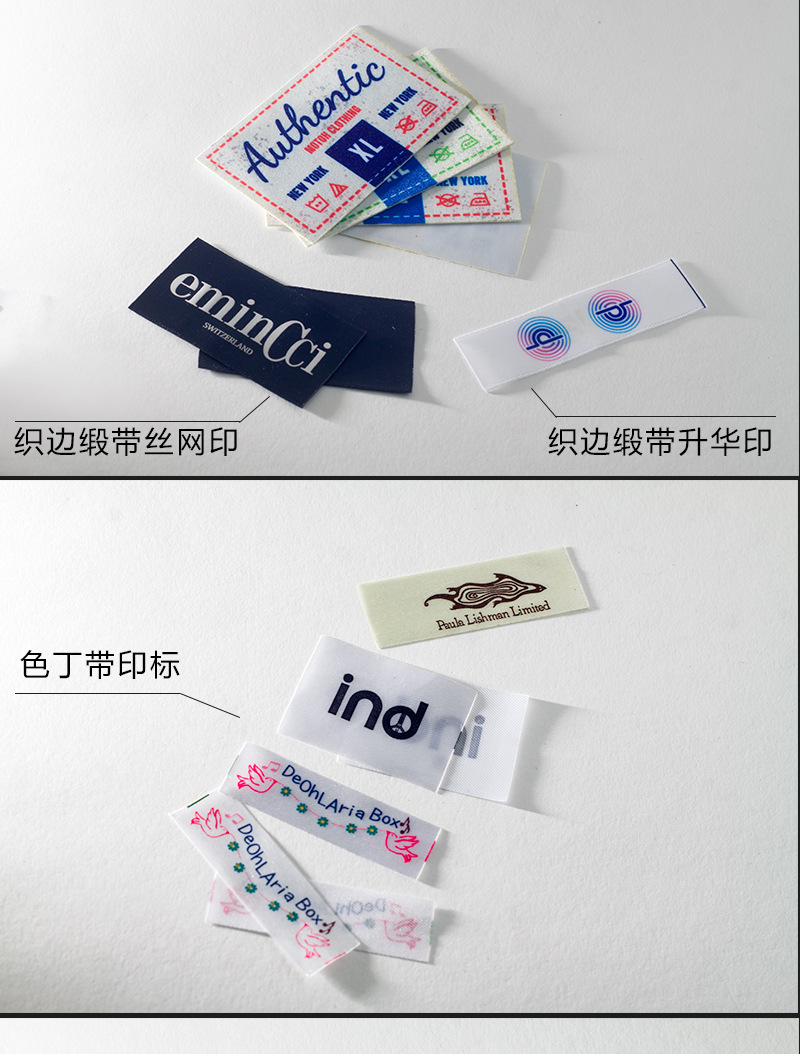 ——印嘜布標(biāo):廣東服裝印嘜廠家通過油墨印刷來表達(dá)文字,圖案及LOGO??刹捎玫牟牧戏浅V泛。有棉帶,絲帶,緞帶,膠帶等等。作為服裝的嘜頭(也叫作領(lǐng)標(biāo),主嘜,主標(biāo),領(lǐng)嘜),一般用棉帶與緞帶。